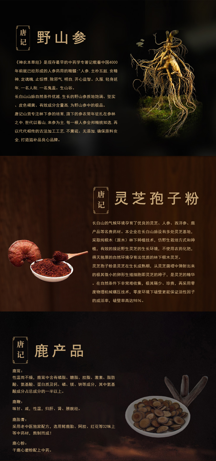 唐記山貨(唐山)商貿有限公司以吉林、遼寧長白山山脈兩大林區為依托,主要從事林下參、靈芝的種植,野山參的采挖以及人參、西洋參、鹿茸等滋補保健品類中藥材飲片的加工與銷售。公司致力于自產、自銷,價格親民。